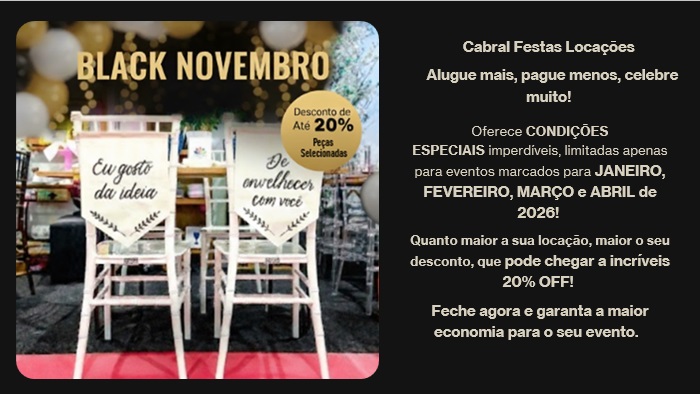 Esta promoção é válida EXCLUSIVAMENTE para contratos de locação fechados no mês de novembro e cuja data de realização do evento esteja compreendida SOMENTE nos meses de JANEIRO, FEVEREIRO, MARÇO ou ABRIL de 2026. Não haverá exceção ou prorrogação deste período.